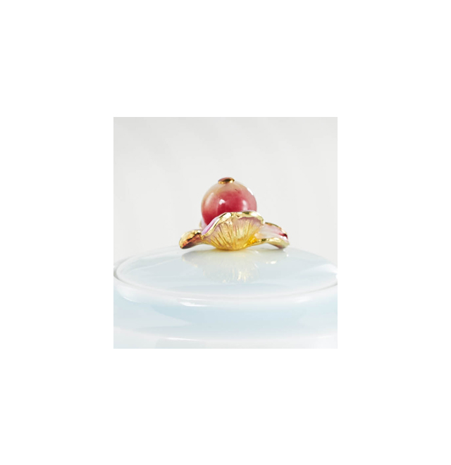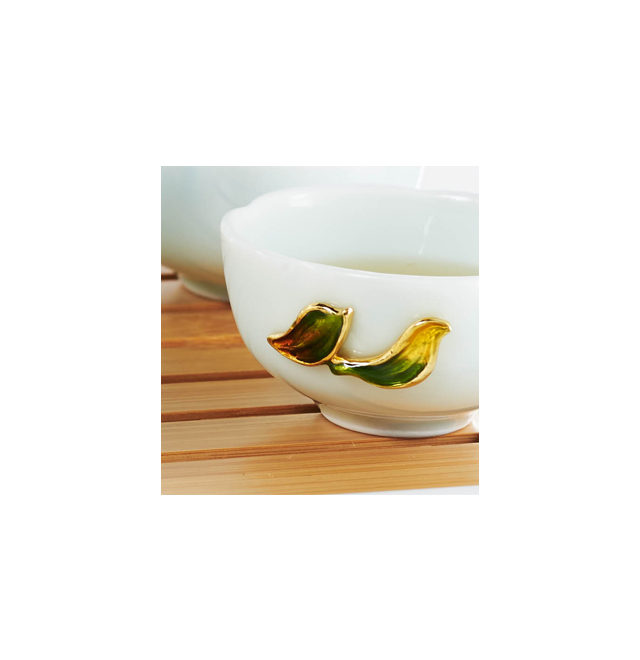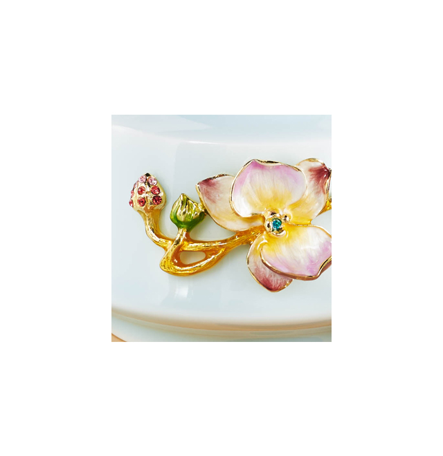作品杯身采用中國瓷器史上赫赫有名的影青釉,有晶瑩如玉的美稱,高溫1360度燒制而成,瑩潤精細(xì),晶亮透徹。茶壺側(cè)面立體雕刻了一朵盛開的蝴蝶蘭,兩個(gè)含苞待放的花苞,還有些許葉子,因琺瑯彩上色令其呈現(xiàn)豐富的層次色彩漸變感,宛如從大自然采集而來的一束蝴蝶蘭,晶瑩通透的玉石化為壺蓋,令茶飲更具詩意和品味。花心鑲嵌水鉆,細(xì)節(jié)處彰顯考究工藝。蝴蝶蘭形似蝴蝶,色彩又鮮艷明媚,可謂是嬌艷動(dòng)人,更有“洋蘭皇后”的美稱,象征事業(yè)亨通,鴻運(yùn)當(dāng)頭,生活美滿。