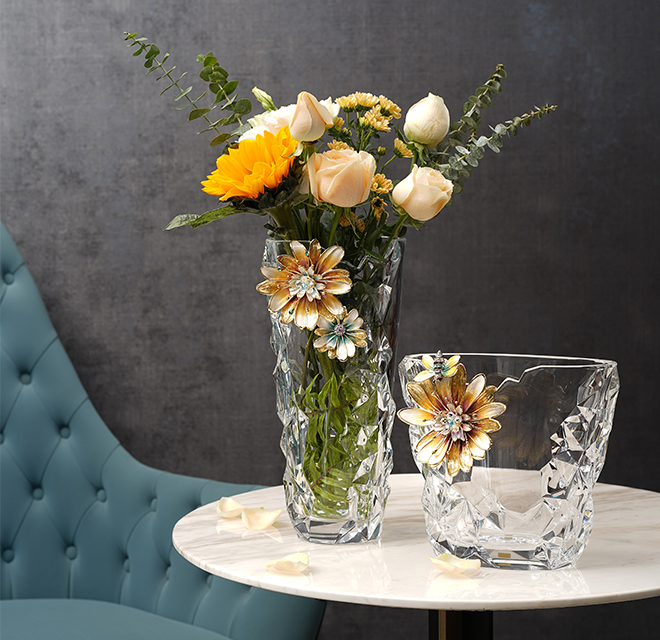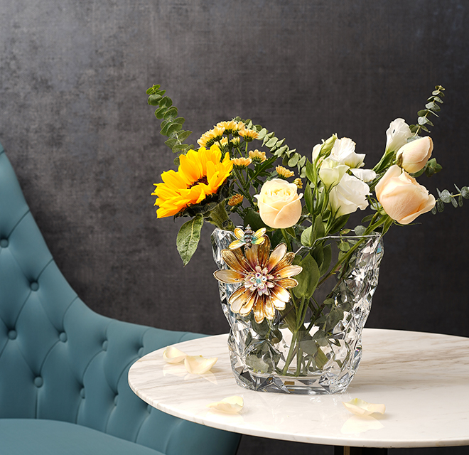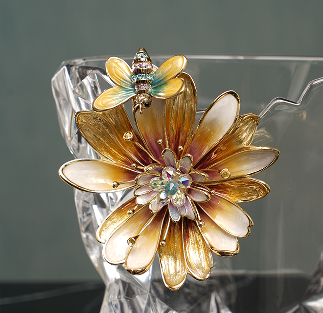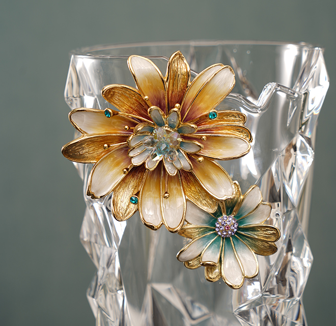 雛菊是意大利國花,象征著幸福、和平和希望。淡雅的花瓣以咖金色為主,花心以珠寶鑲嵌工藝而成,在家居空間里盡綻光芒,呈現令人為之心動的現代美感。