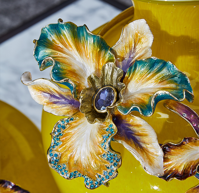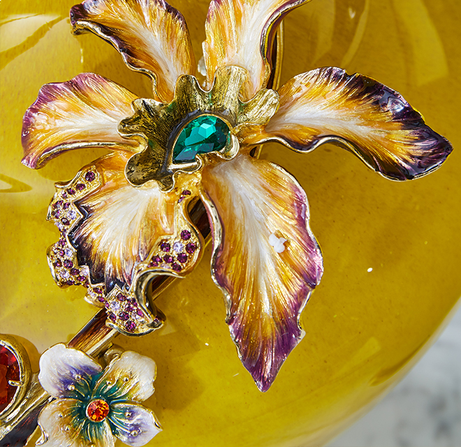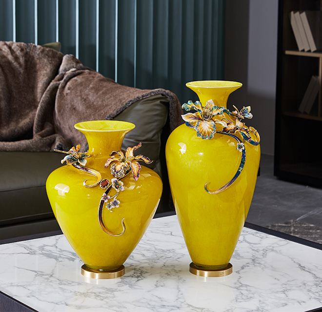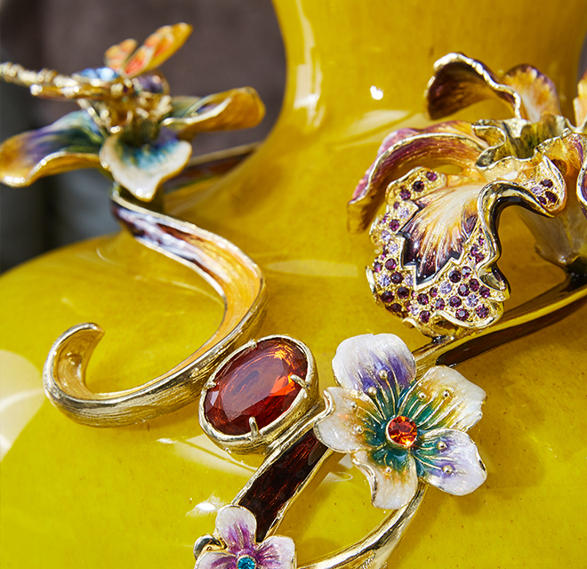 采用黃色高溫亮釉陶瓷作為瓶身,黃色自古以來是皇帝的專用色,象征著榮華富貴與希望。羅比羅丹研發的琺瑯彩技藝,賦予鳶尾花優雅特質及華美色彩,而彌足珍貴的水鉆鑲嵌其中,高貴華麗、別具特色,蝴蝶翩翩起舞,共同譜寫一曲撼動人心的自然家居藝術作品。