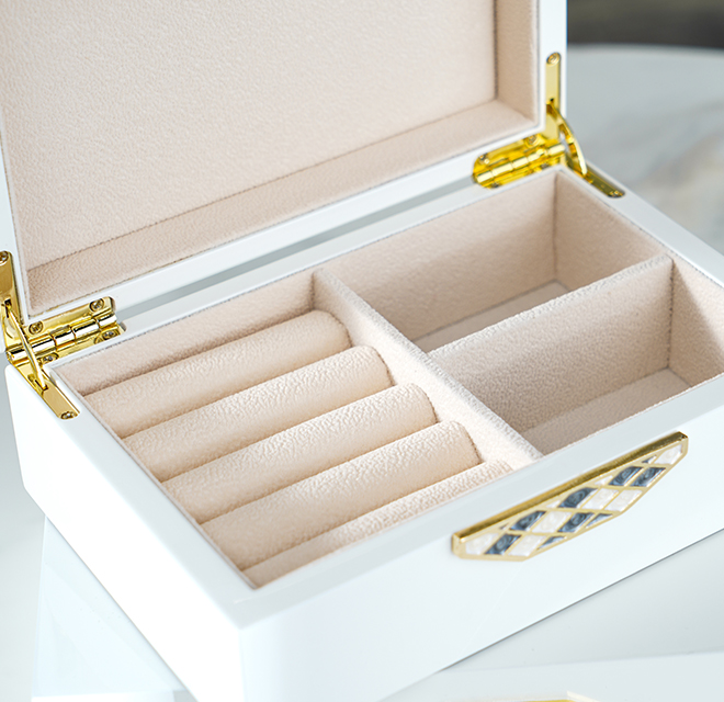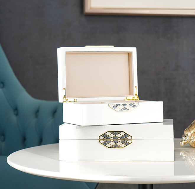 作品甄選月白色鋼琴漆木精制而成,在質量和尺寸上精益求精,設計簡約大氣、現代輕奢。菱形金邊鏤空線條交織而成,紋理經典優雅,部分菱格填以墨綠色琺瑯彩,持久綻放華光。