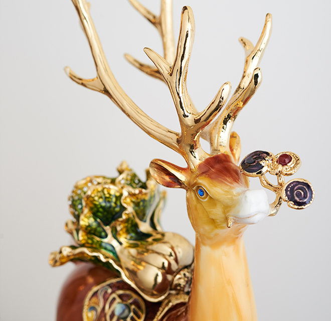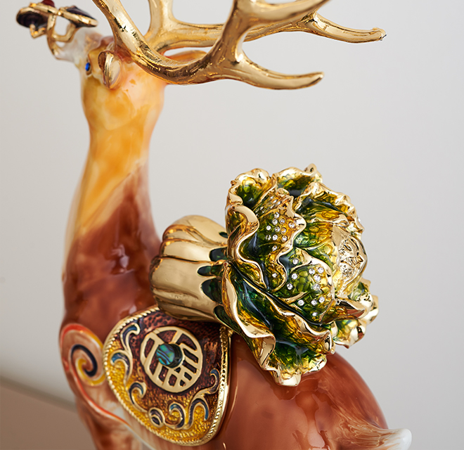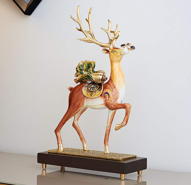 作品造型奇異獨(dú)特,層次豐富,各式元素創(chuàng)意組合,締造出雅致的藝術(shù)視覺享受。鹿,諧音“祿”,取高官厚祿之意,象征事業(yè)有成。鹿還寓意著健康長壽、生活富裕。