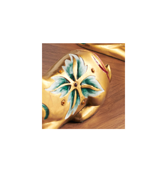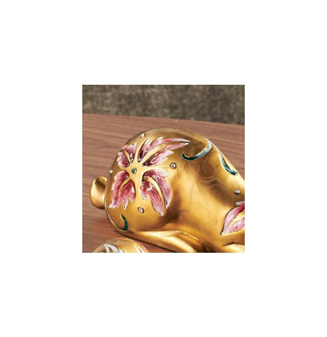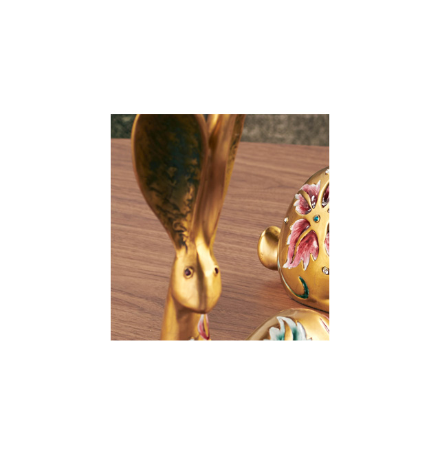 光滑亮澤安詳?shù)拿韧米樱辖痂T造極具現(xiàn)代異域風情,兔子身上由四瓣花設(shè)計而成的花朵綻開,粉色和綠色琺瑯彩工藝實現(xiàn)漸變唯美效果,彌足珍貴,耳朵上的墨綠色渾然天成。作品設(shè)計落落大方,采用暗線設(shè)計,更顯精美絕倫。